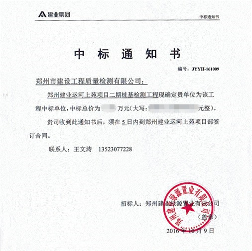 近日,在鄭州建業(yè)綠源置業(yè)有限公司舉辦的“鄭州建業(yè)運河上苑項目二期樁基檢測工程項目”招投標(biāo)中,我公司一舉中標(biāo)。
